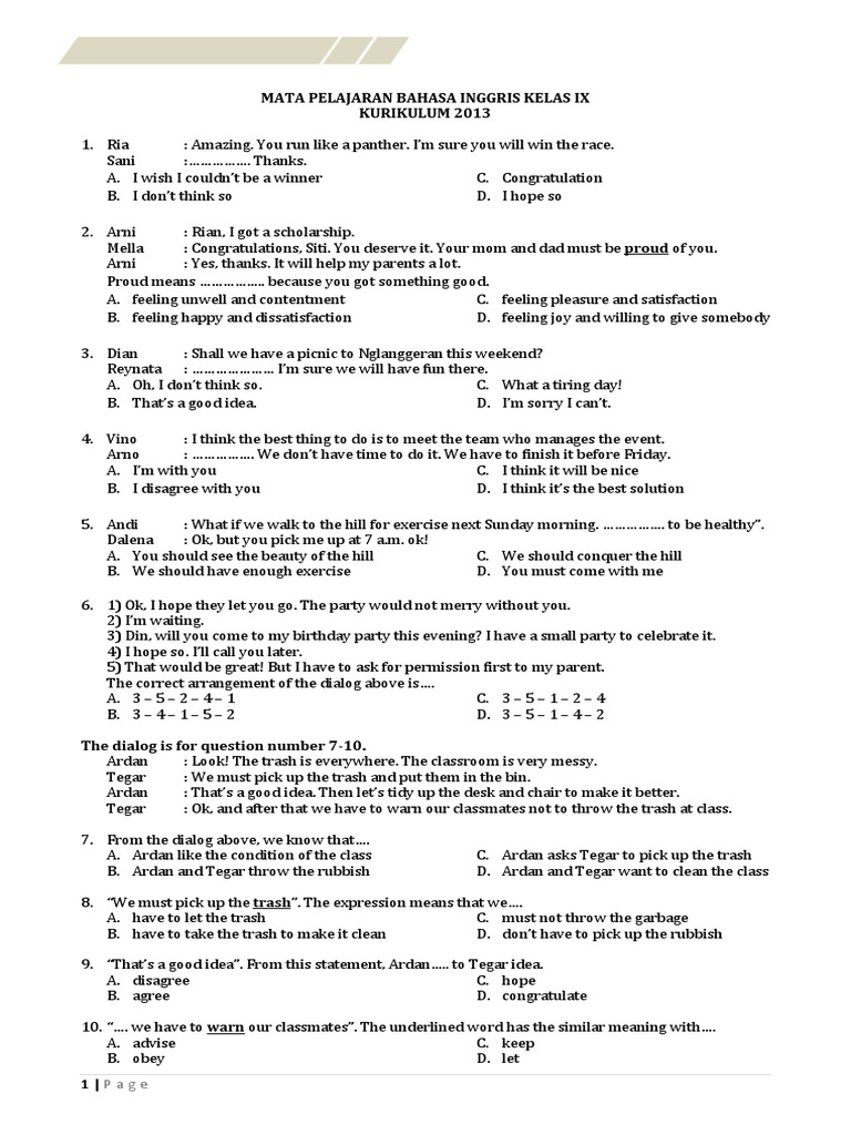 Latihan soal uts ips kelas 9 semester 1 kurikulum 2013. 30 jul 2020 — kisi kisi soal bahasa indonesia kelas 8 semester 1 kurikulum 2013,. Berikut ini adalah contoh soal penilaian tengah semester pts uts mata pelajaran bahasa inggris kelas 8 viii semester 1 ganjil gasal smp mts berdasarkan kurikulum 2013 edisi revisi 2016 2017. Apakah kamu sudah siap untuk menghadapi ujian akhir semester kali ini? Soal try out (uan) bahasa inggris kelas ix soal bahasa inggris kelas 9.