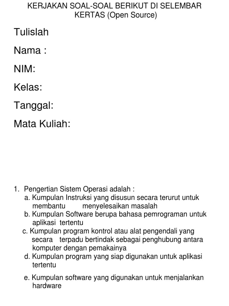 1 from Mengontrakkan sebagian atau semua operasi komputer perusahaan kepada organisasi jasa diluar perusahaan adalah. Sistem operasi membuat ko mputer menjad i leb ih nyaman. Latihan soal uts imk 1. Soal diambil dari pertemuan yang telah diajarkan oleh dosen. Untuk saat ini admin akan memberikan soal dan jawaban uas sistem operasi loh. Sistem operasi slax yang mampu menjalankan beragam aplikasi windows di linux adalah. Tugas pertemuan sistem operasi semester 3 univ.bsi. Sap sistem operasi sumber :